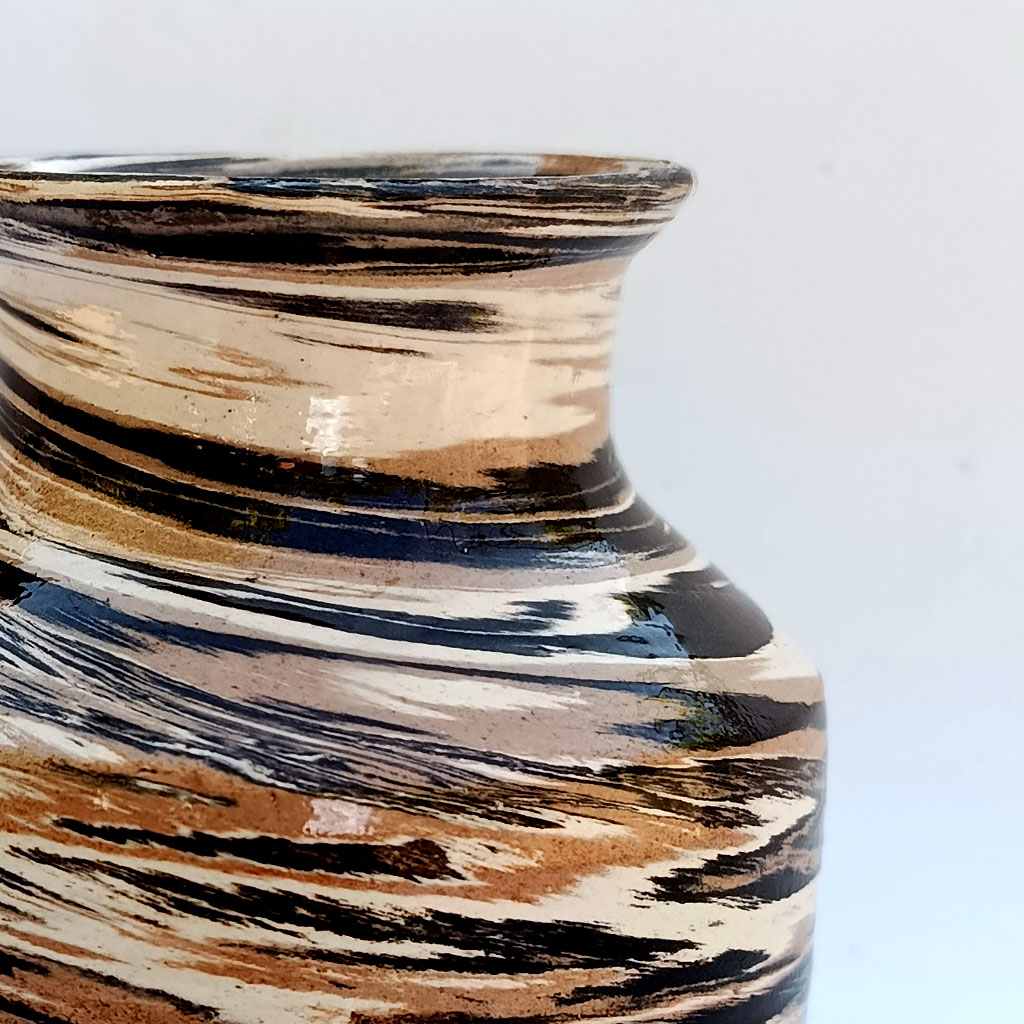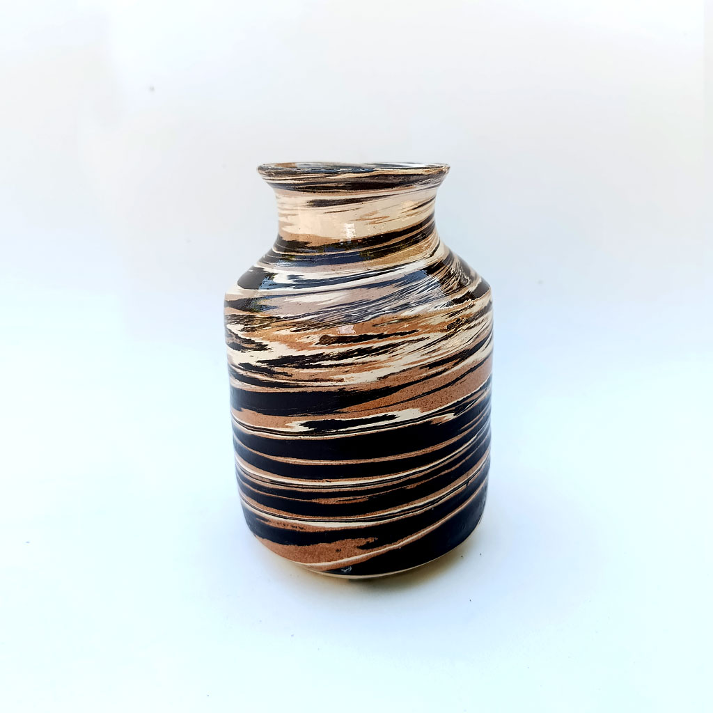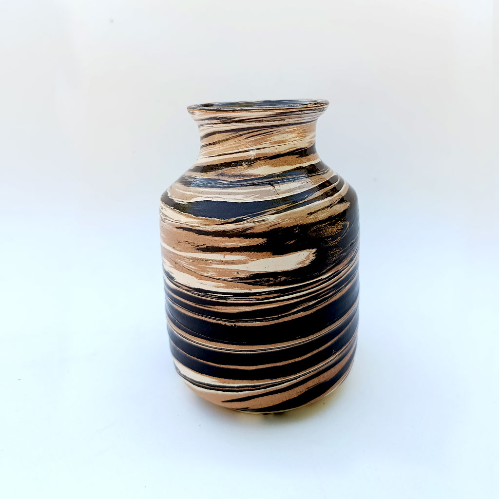 Jarrón pequeño, realizado al torno con barros de varios colores.