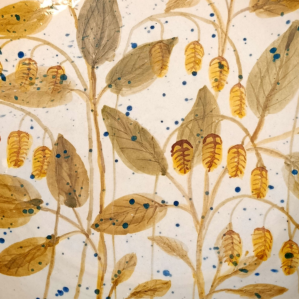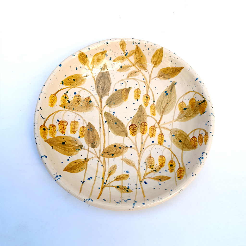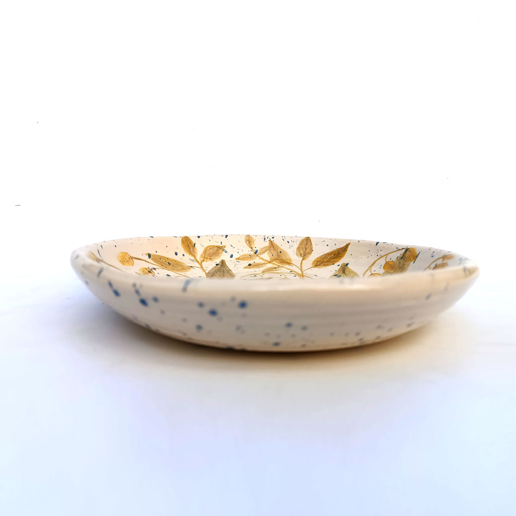 Pieza realizada a mano y torno en gres, pintada a mano.